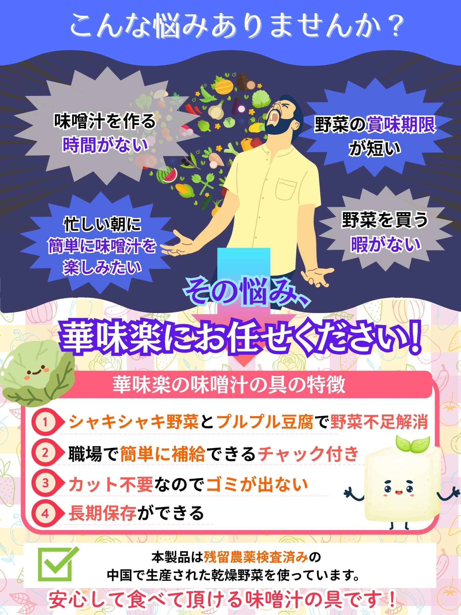 華味楽 かみらく みそ汁の具 200g 味噌汁 ドライベジ 残留農薬検査済み 中国産 豆腐 ねぎ キャベツ ニンジン 乾燥野菜 カット野菜 長期保存 保存食 業務用 大容量