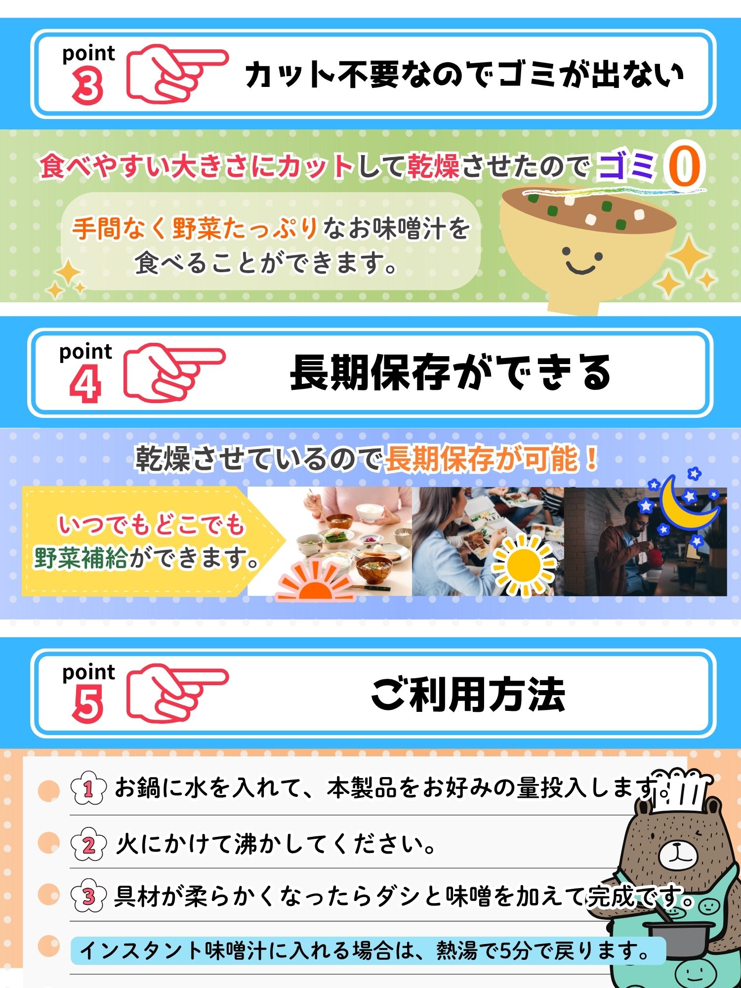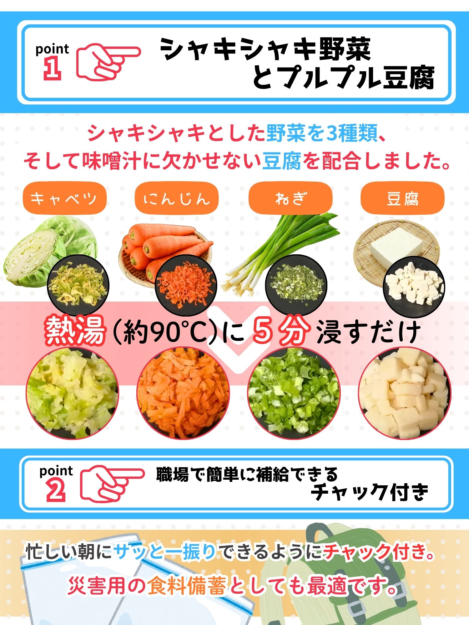 • 【✅ インスタント味噌汁を利用する場合 】95℃以上の熱湯に入れて5分待ってください。お湯の温度が低いと芯が残ることがございます。