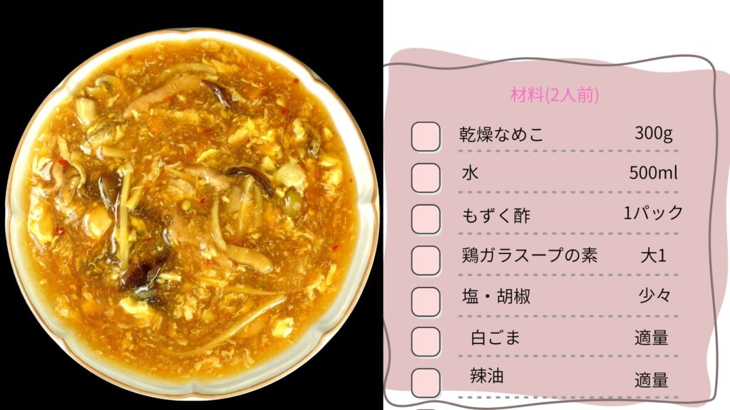 乾燥なめこを使ったレシピ 2025年11月21日 Filed under: レシピ master なめこの酸辣湯スープ 水と乾燥なめこを火にかけて沸騰させる 沸騰したらもずく酢と鶏がらスープの素を入れる 沸騰状態で卵を溶いて入れる サッとかき混ぜる 塩コショウで味を調えます 辣油と白ごまを入れて完成