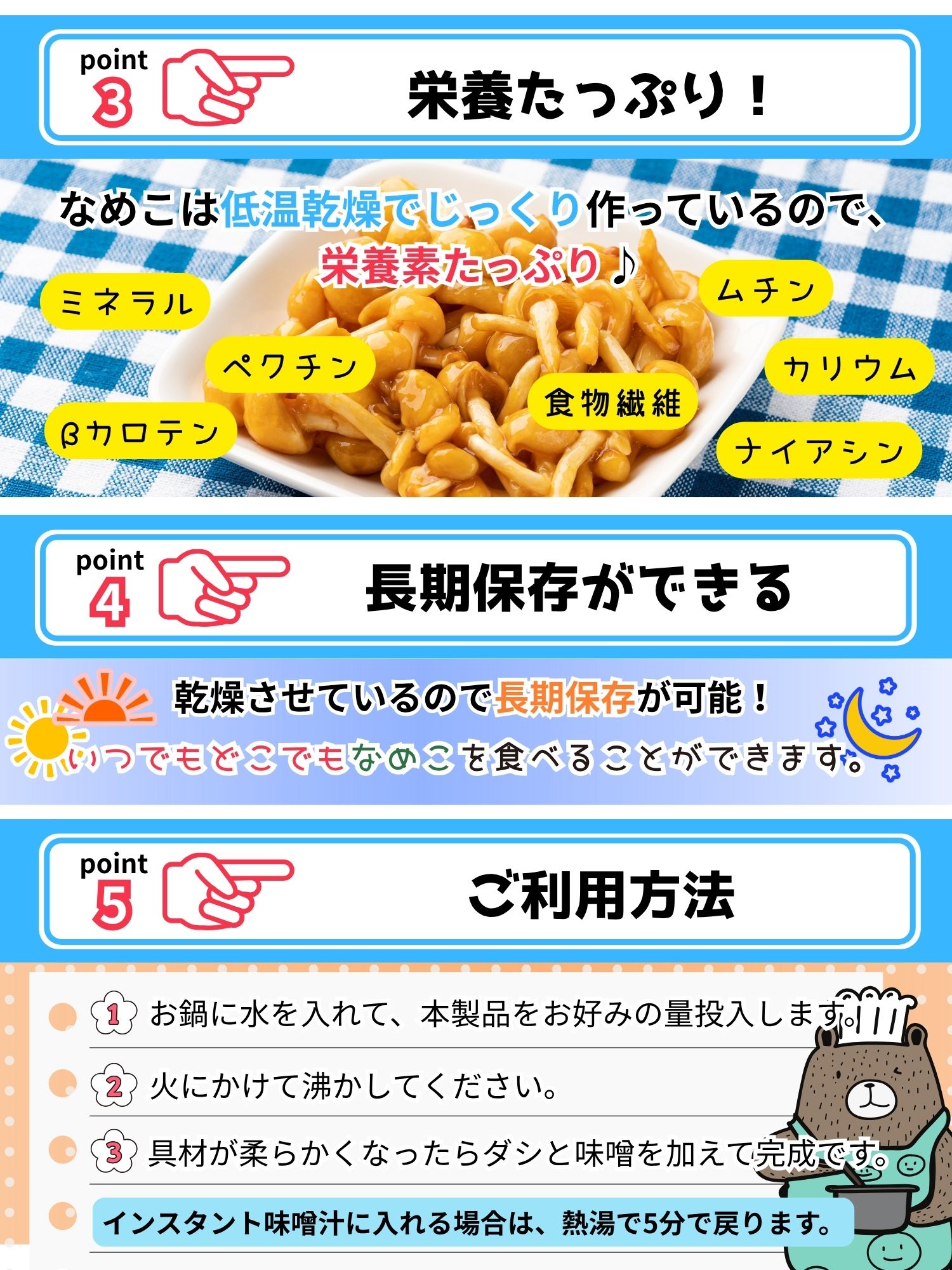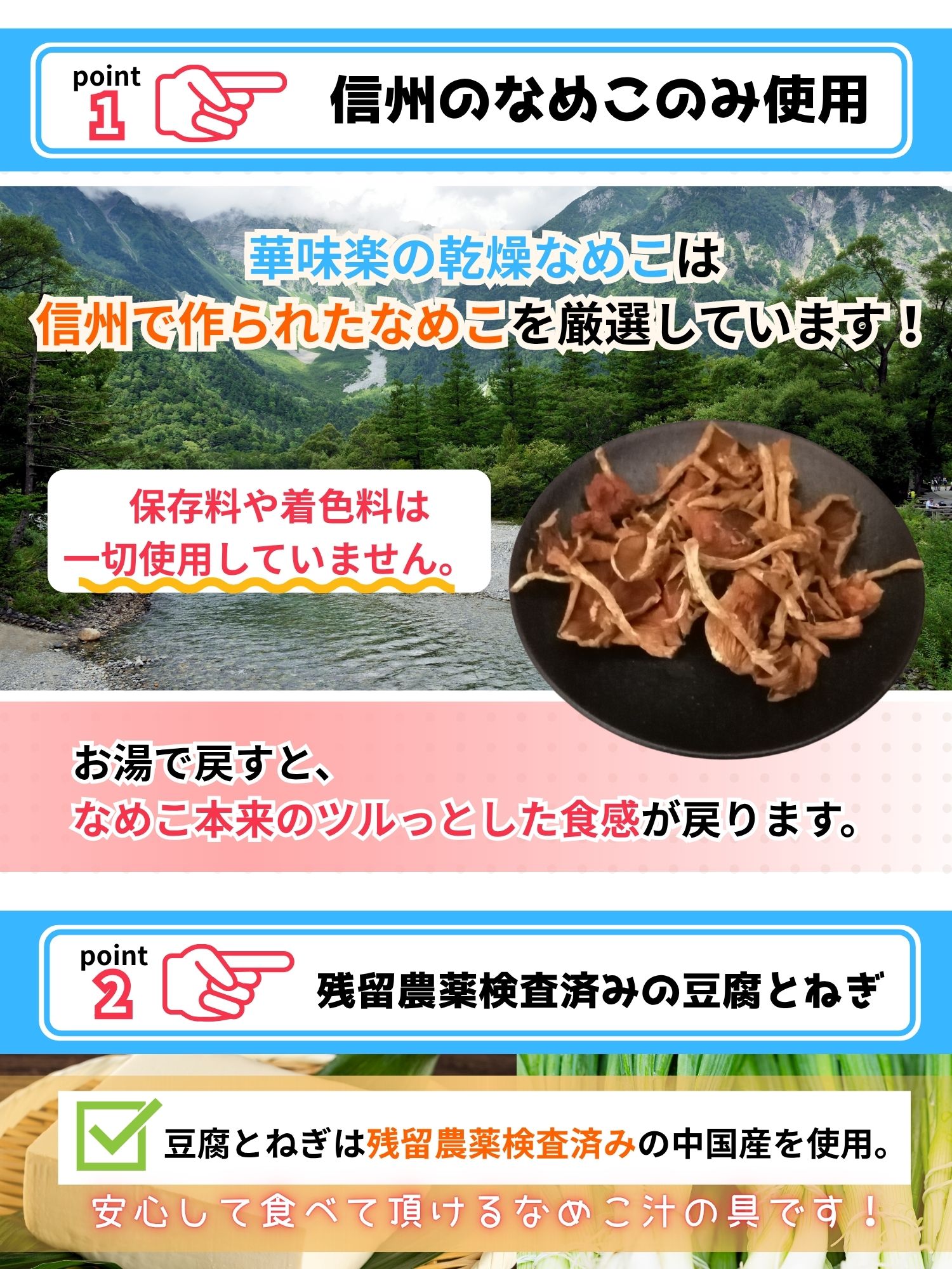 - 【✅信州産なめこ】なめこ汁に欠かせないなめこは信州産を採用。ツルっとして食感と香りが食欲をそそります。低温乾燥することでミネラル、べクチン、βカロチン、カリウム、ナイアシン、食物繊維がたっぷりです。